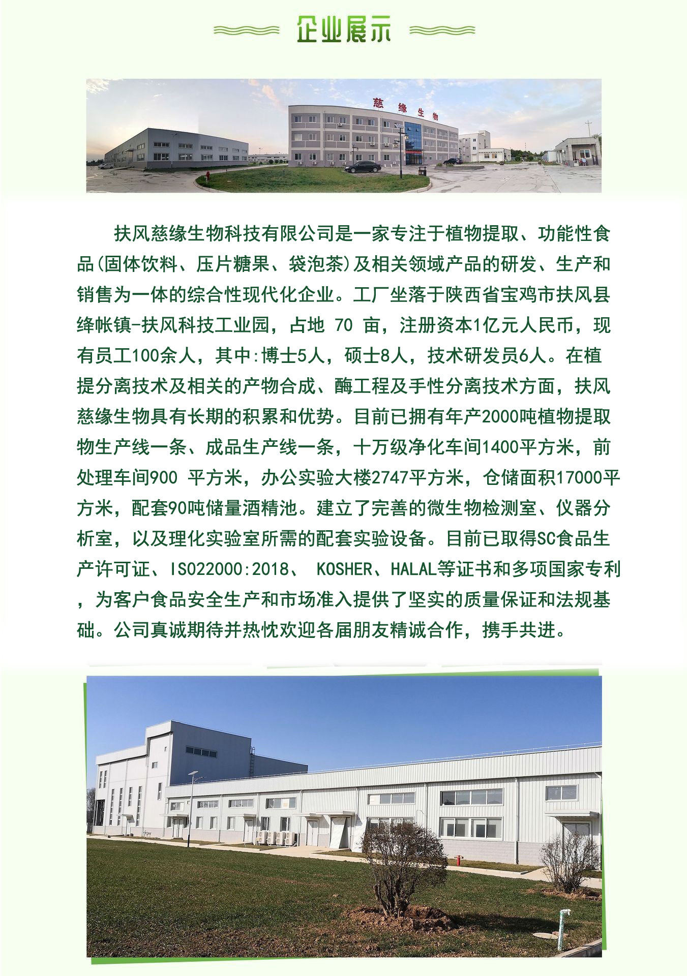 1.扶風(fēng)慈緣生物主要從事各類植物提取物的研發(fā)、生產(chǎn)、銷售。常年供應(yīng),可滿足客戶不同需求。